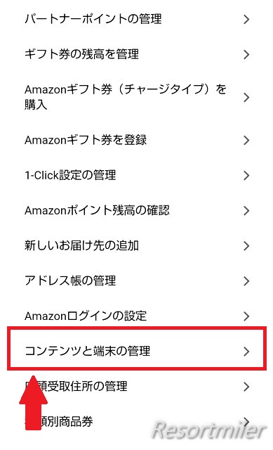 スマホ画面だと真ん中あたりにある「コンテンツと端末の管理」をタップ。