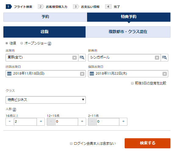 飛行機に乗るなら、やっぱり直接行ける直行便がいいですよね。検索方法は特典予約ー往復から出発地と到着地、日程を入れるだけ。