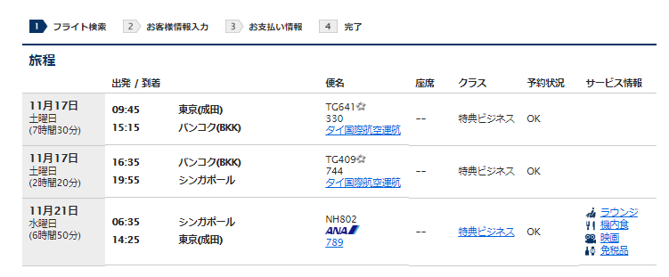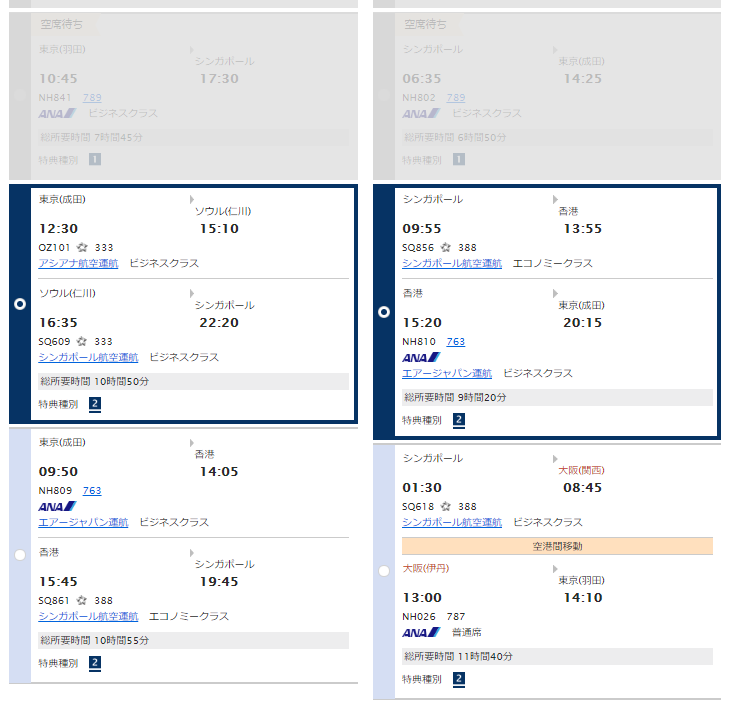 一つ、注意しておきたいのは、特典航空券は便名ではなく運航エアラインに合わせて取ることになります。スターアライアンスの便名が入ったフライトではなく、どのエアラインが運航しているかということですね。