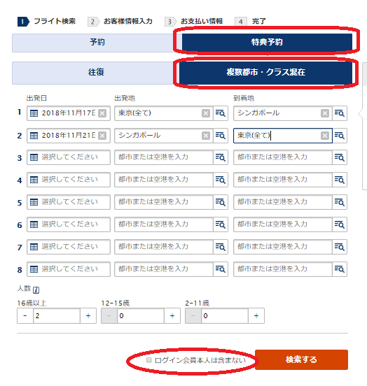 いえいえ、そんなことはありません。別の探し方として、複数都市・クラス混在で探す方法があります。赤枠で囲ったところをクリック。ログイン会員本人は後述。入力する内容は先ほどと同じ条件で検索してみます。