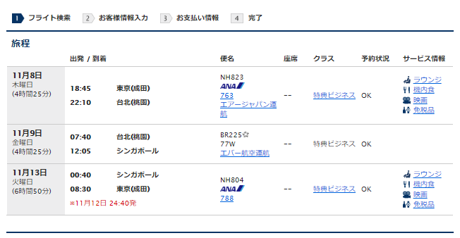 こんな感じでTPE経由が予約できます。台北ーシンガポール間はエバー航空の長距離機77Wが飛んでいます。日本には77Wが就航していないので、乗れるのはうれしいですね。