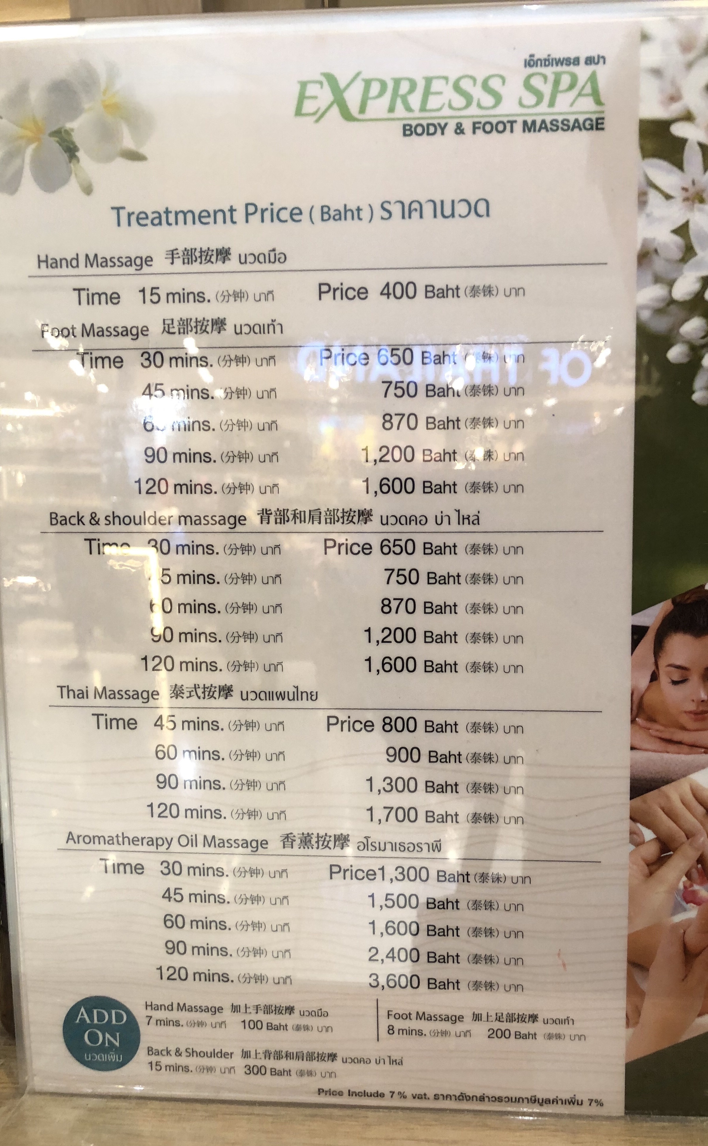 EXPRESS SPAは制限エリアの外に1箇所、制限エリアの中に2箇所あります。ここは制限エリアの中にある2つのうち、一つはマッサージだけで、もう一つはサービスの多くタイ古式マッサージとオイルマッサージを受けることができます。
