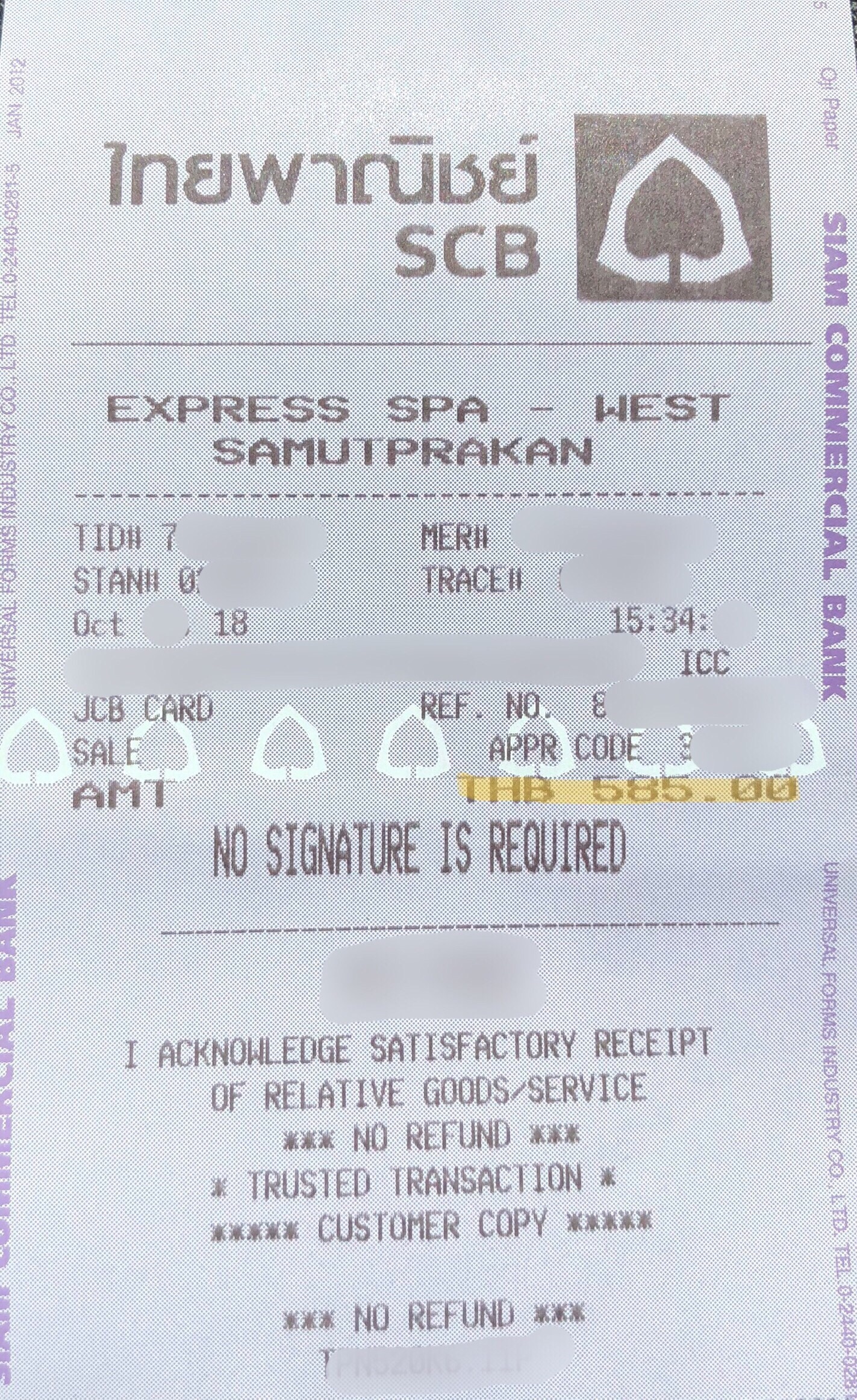 ちなみに、EXPRESS SPAでは、JCBのクレジットカードで支払うと、10%割引になります。私はバック&ショルダーを30分受けて、650バーツですが、65バーツ安くなって585バーツになっていますね。