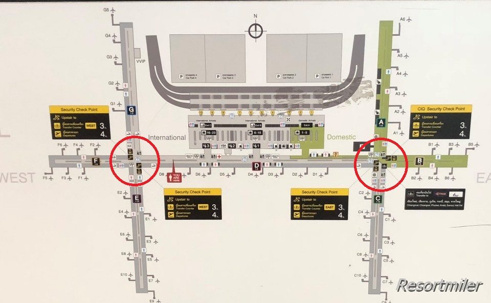 もし別冊で購入した場合、トランスファーカウンターへ寄ってください。バンコクエアウェイズのトランスファーカウンターは両方の赤丸の近くにありました。