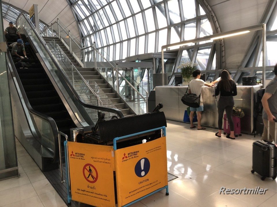 待合室へ降りるエスカレータは工事中でした。バンコク、というか東南アジアあるあるですね。