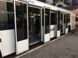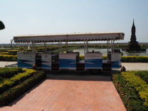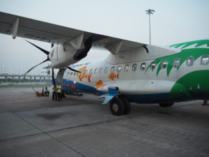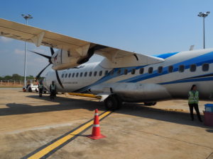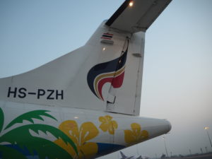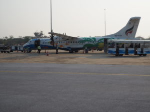 スコータイ空港への機材はフランスとイタリアの合弁会社ATR社によって開発された、双発プロペラ機ATR-72です。スワンナプーム国際空港ではバス移動。プロペラ機が間近で見れて、ちょっと興奮!デザインもかわいいですよね。