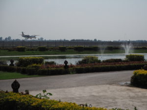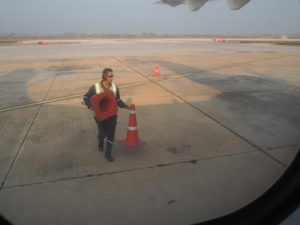 スコータイ空港へ到着。カラーコーンを持って準備しています。ちなみに、奥に見えるのが滑走路です。