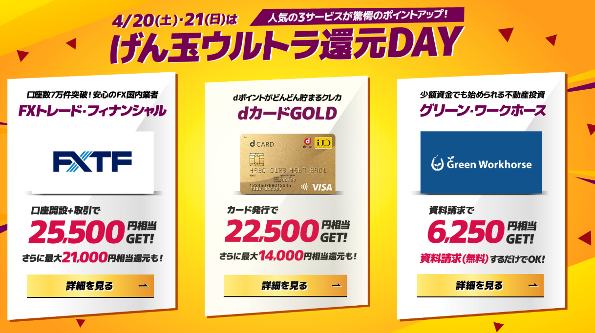 会員登録から100日以内にげん玉経由で300,000ポイント以上の有効ptを貯めたら、ボーナスで50,000ポイントがもらえます。