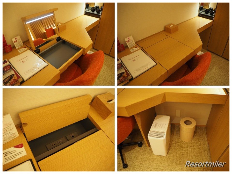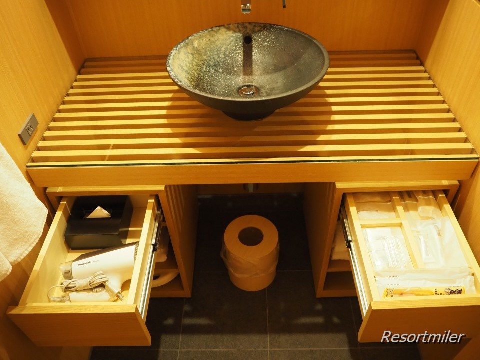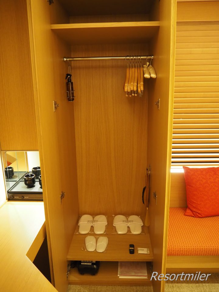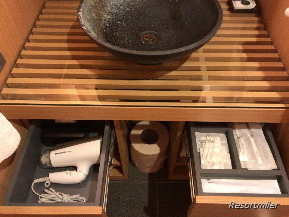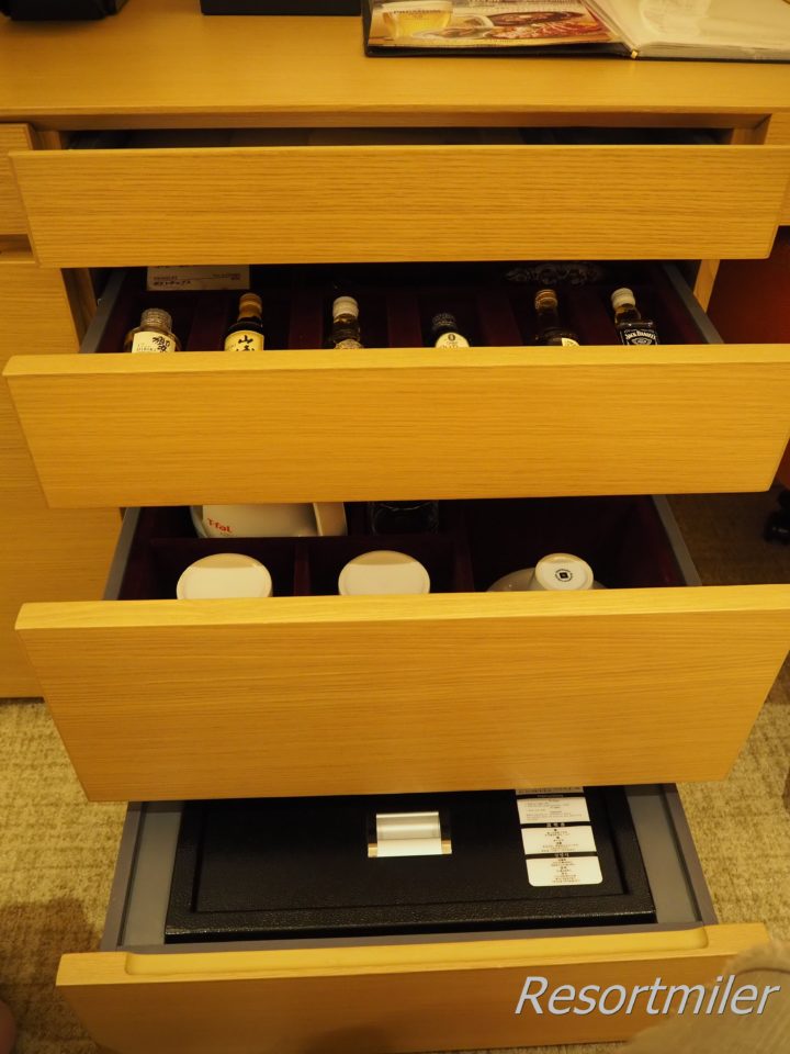 引き出しには、ミニバーやマグカップ、金庫があります。