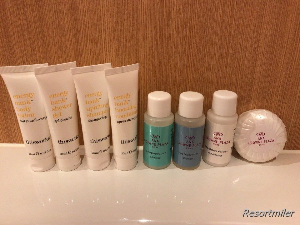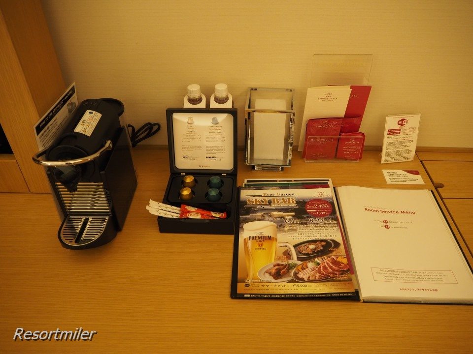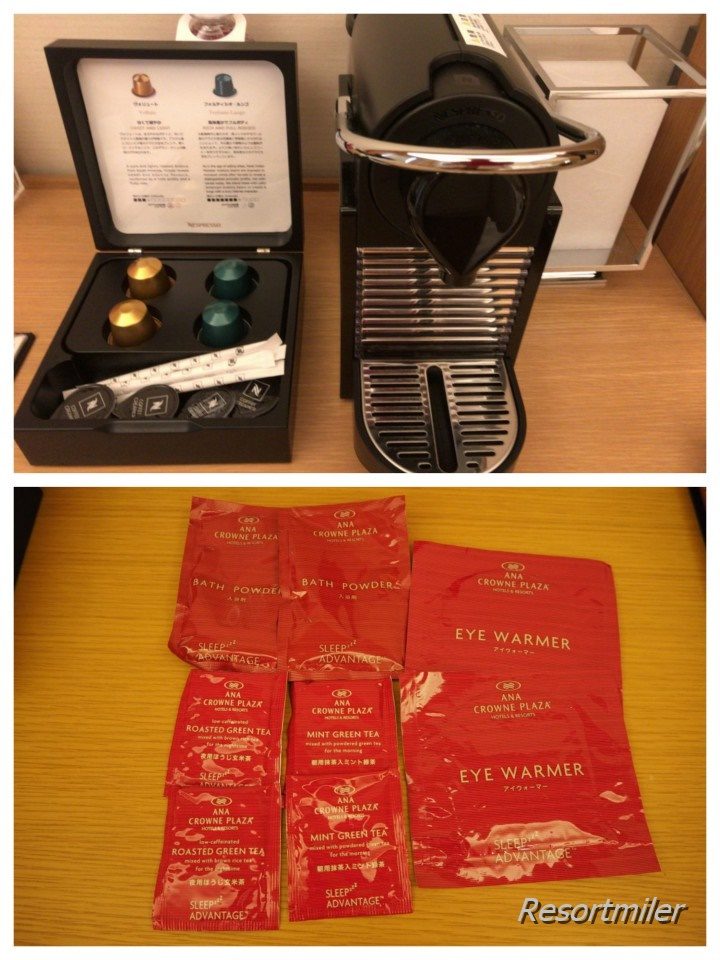 下の写真はクラウンプラザが推奨する安眠システムの一つ。昼夜用のお茶や入浴剤、愛をーまーです。