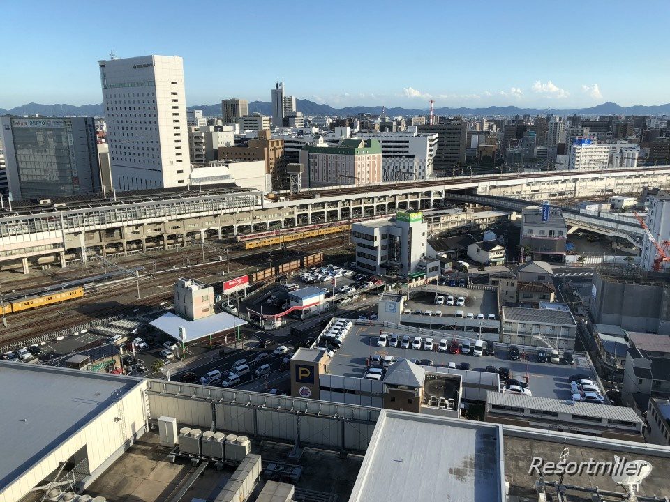 私が宿泊した16階から撮影したこちらの景色をご覧ください。岡山駅が目の前で線路がたくさん見えます。奥には山々が連なっています。