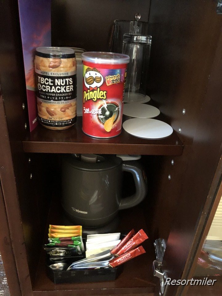今回はアップグレードできる部屋が満室ということで、ミニバーがすべて無料に。お菓子もジュースも缶ビールも無料。これは部屋のアップグレードがなくても、うれしいサービスですね。