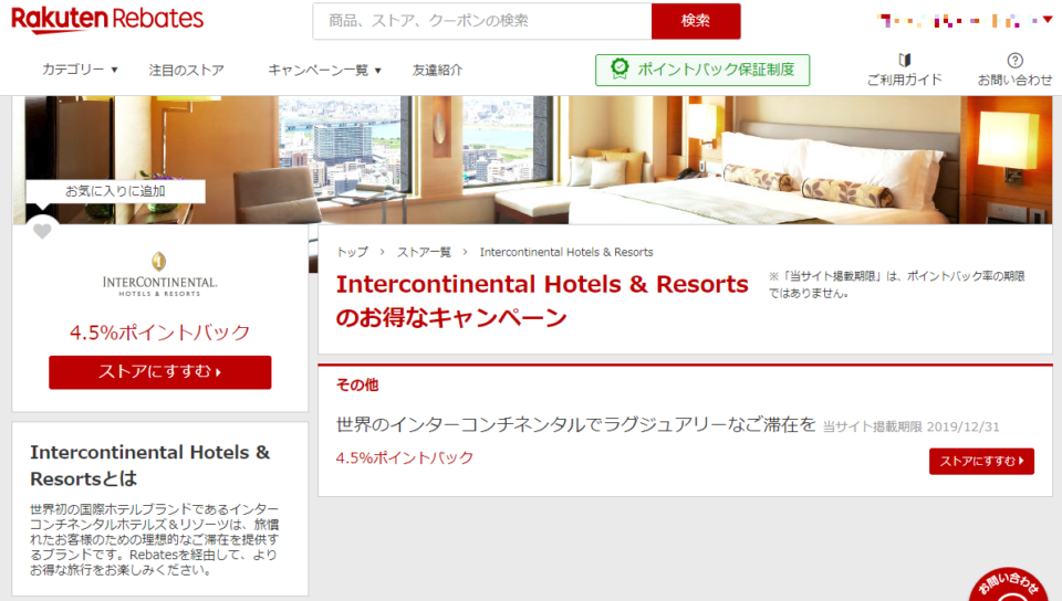 IHG系ホテルに泊まるとき、キャッシュバックサイトを経由すると、最大10%を還元してもらえます。要は10%値引きとほとんど同じ。