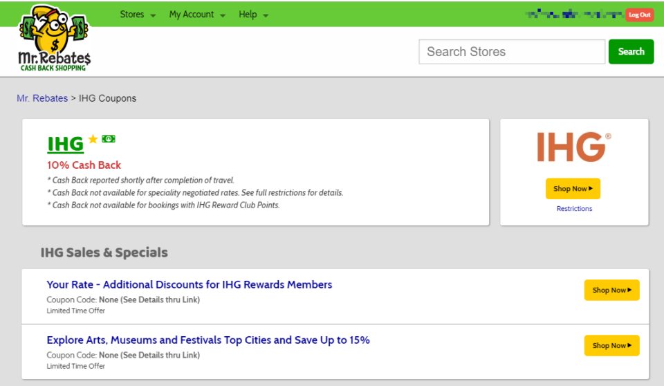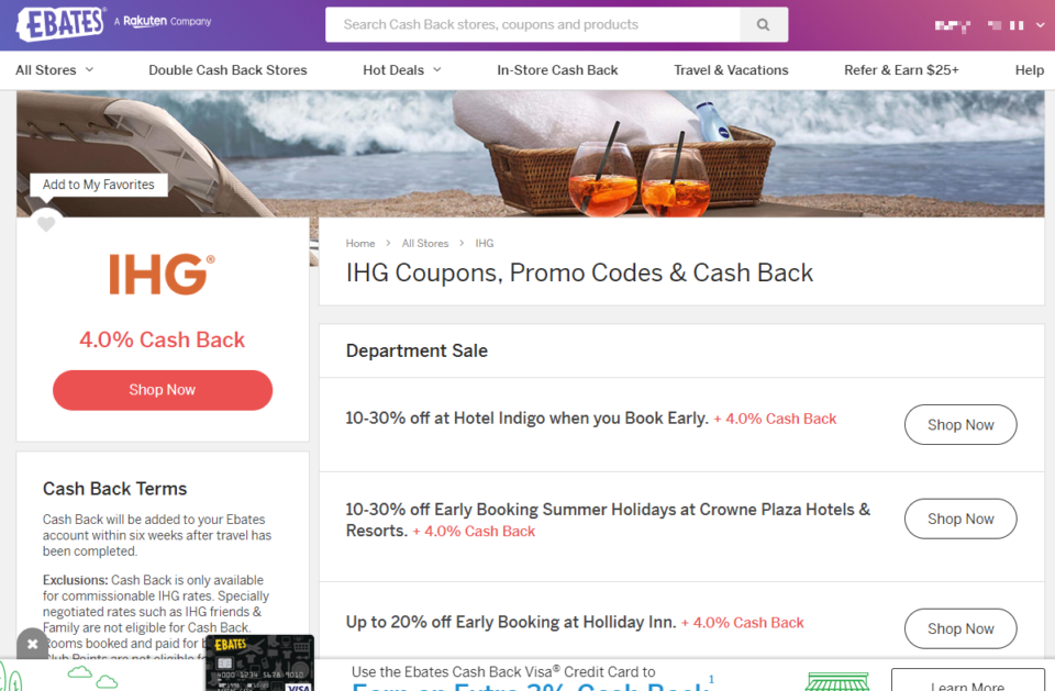 Mr. Rebates経由でIHGを予約すると、6~10%のキャッシュバックを受けることができます。2019年1月5日時点では、10%のキャッシュバックです。最もお得になっていますね。