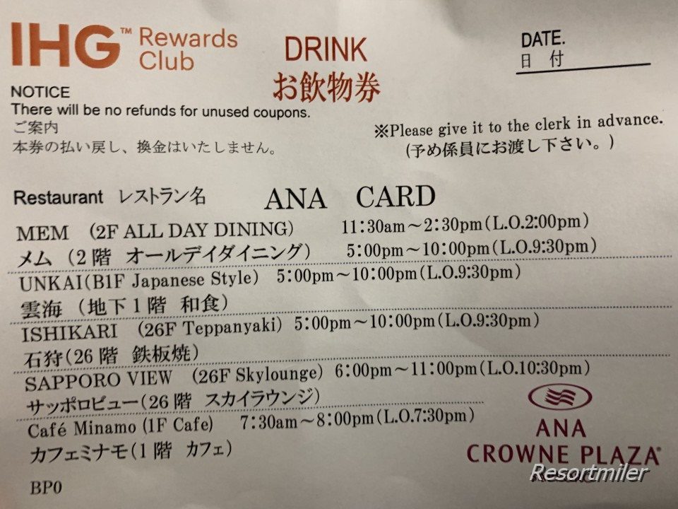 SFC会員特典として頂いたドリンク券はこのサッポロビューの他、朝食のメイン会場のメム(MEM)や雲海(UNKAI)、カフェミナモ(Cafe Minamo)で利用できます。
