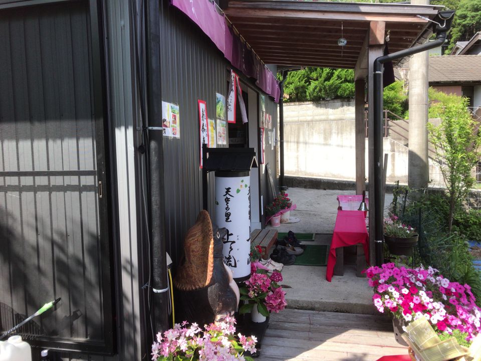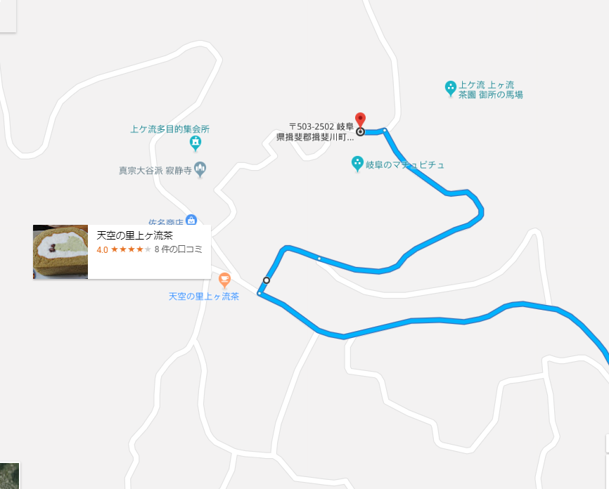 何か休憩できるところはないかなと思い、バイクでちょっと下ってみると、駐車場から少し下ったところにお茶処「天空の里 上ヶ流茶園」がありました。青色の道は車で駐車場へ向かう道、赤い点が駐車場です。通り道ではないので、注意しましょう。