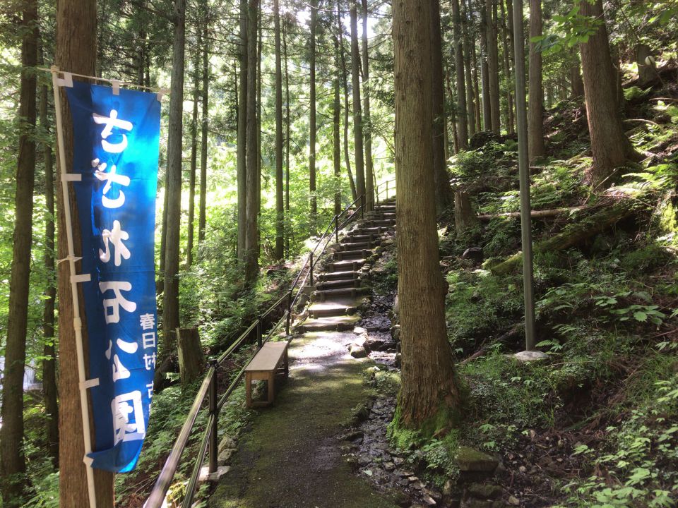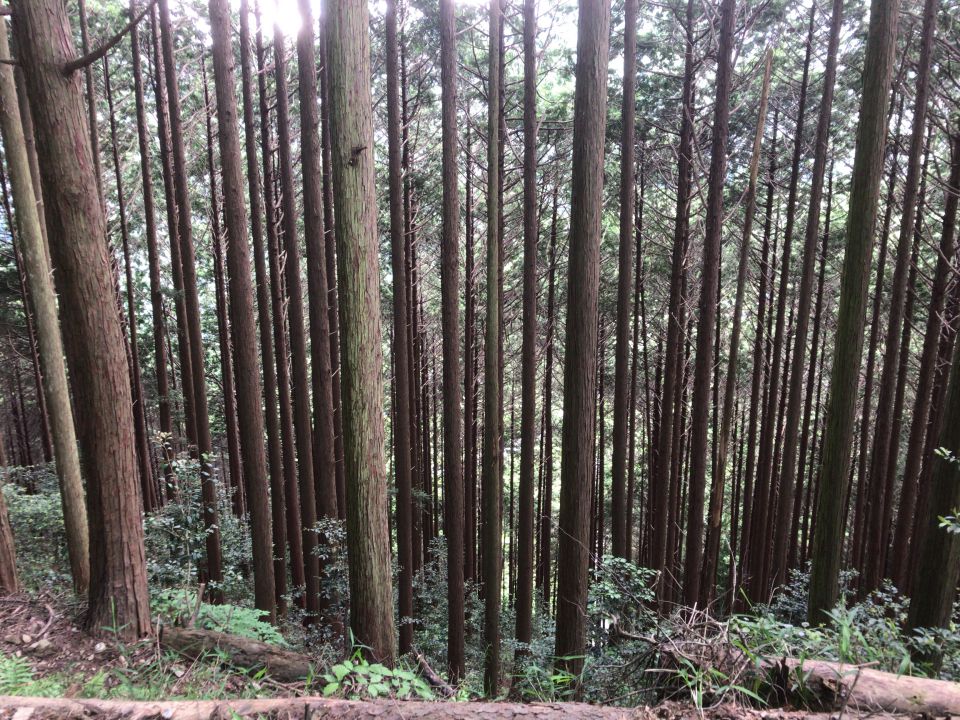 歩き始めて5分ほどで、スギ林の中にある林道へ入っていきます。ここからはけっこうな山道ですので、行くときはスニーカーなど歩きやすい靴にしましょう。
