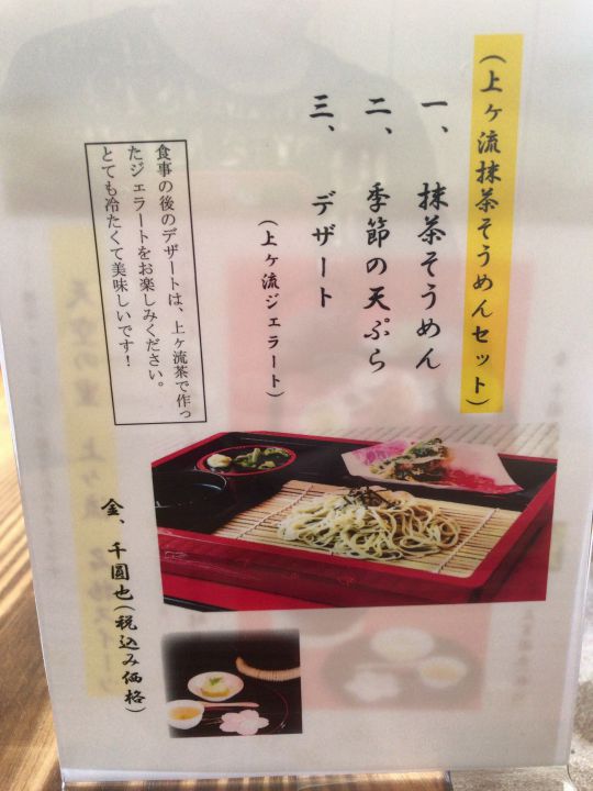 メニューは大きく分けて2つ。一つ目は抹茶を練りこんだ抹茶そうめん。季節の天ぷらとジェラートがいただけます。