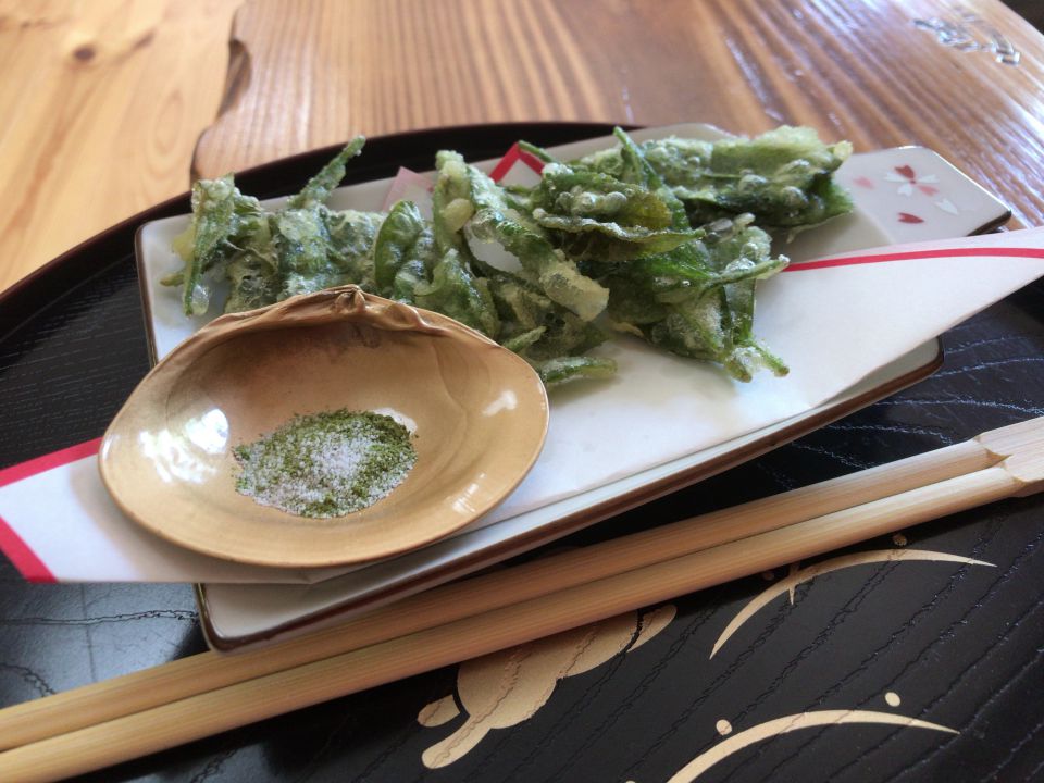 ジェラートの前に、お店の方が「サービスです」とお茶の天ぷらを出していただけました。お茶の天ぷらって、本当にお茶の葉っぱを天ぷらなんです。都会ではできない、産地ならではのお茶の楽しみ方ですね。抹茶塩をかけて頂きました。
