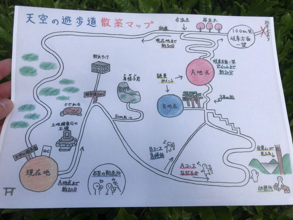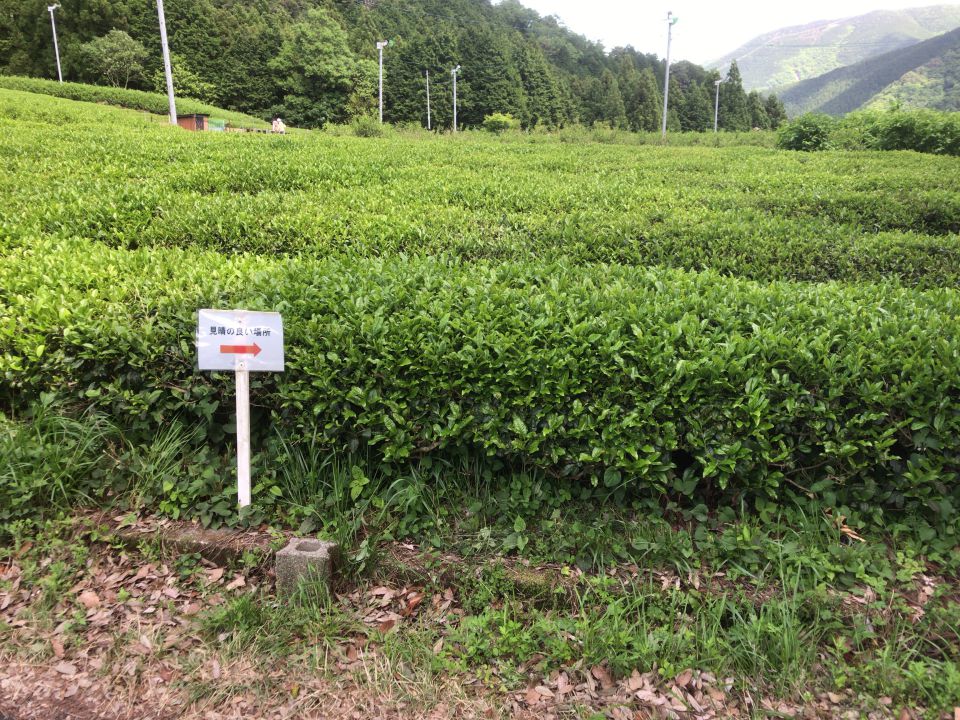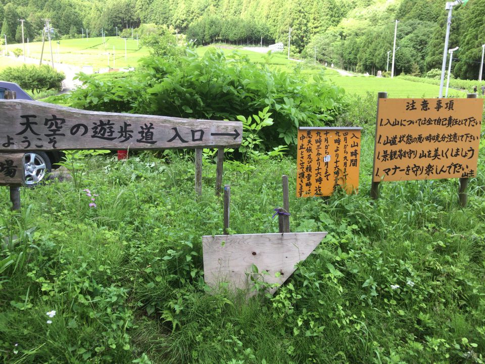 モーターバイクですので、車と同じ駐車場に停車しました。天空の茶畑はどこだろうとあたりを見渡すと、「見晴の良い場所」という手づくりの看板が至る所にありました。地元の方が頑張って作成されているんですね。