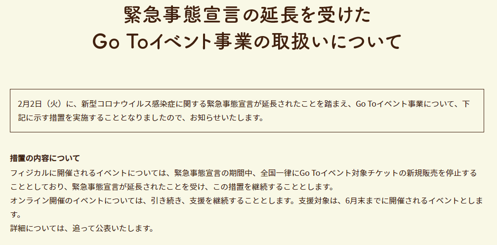 ※1 緊急事態宣言の延長が決定されたことに伴い、一時停止措置を3月7日(日)まで継続いたします。(2月2日(火)発表)なお、2月1日(月)以降の旅行・宿泊商品については、従来より、本事業を適用した販売は認められておりません。(ただし、修学旅行を除きます。)
