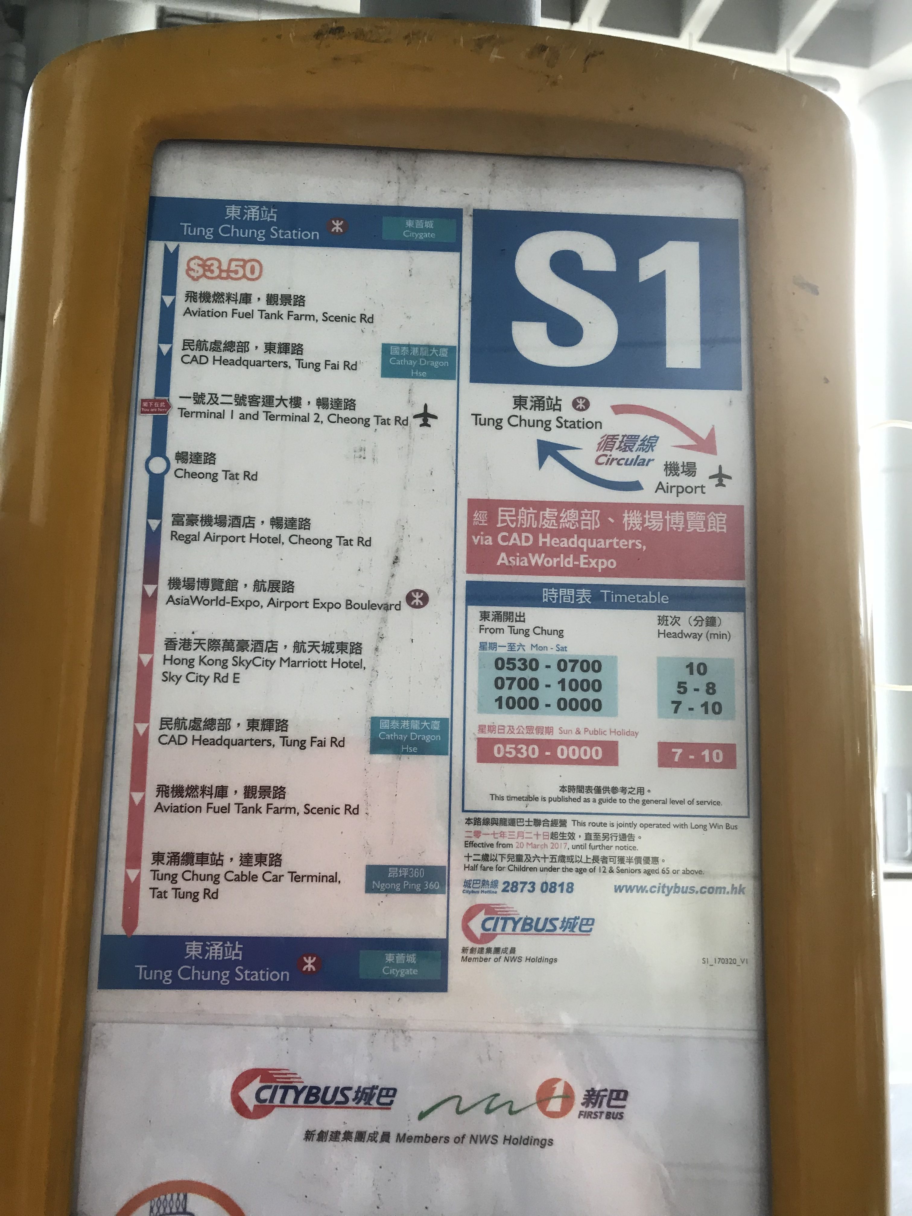 まずは香港空港からMTR東涌駅バスターミナルは路線バスS1に乗って15分、3.5ドルです。