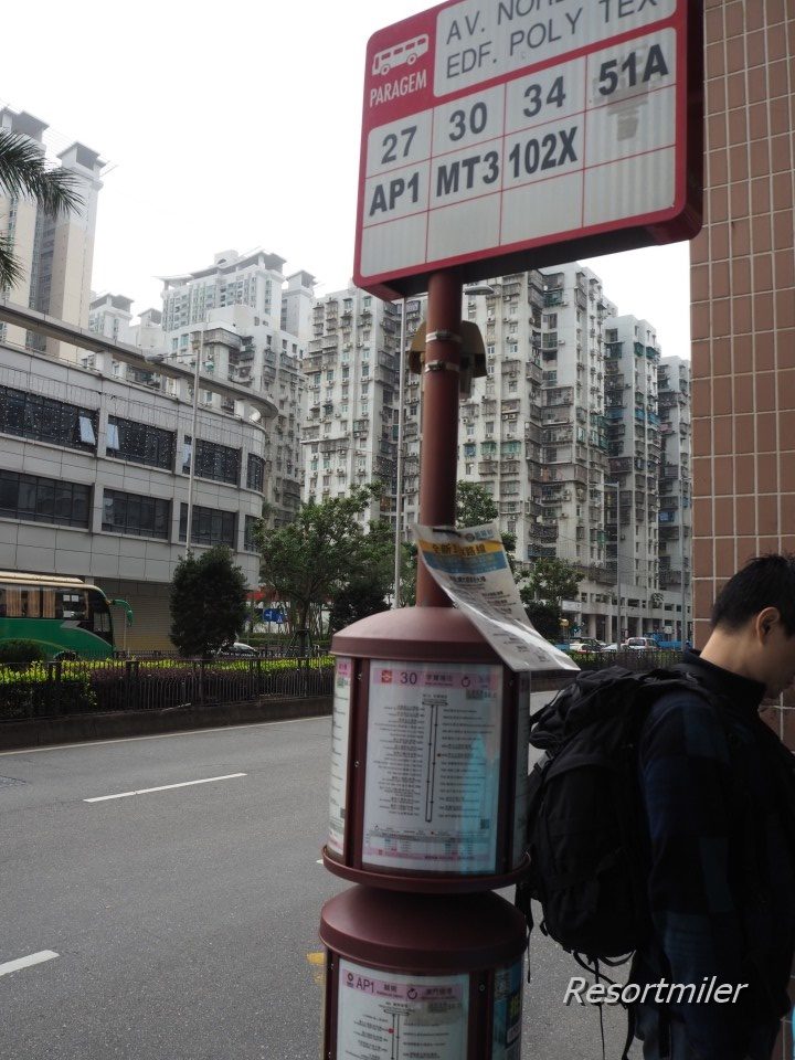 1台で乗り切れない場合は次のバスまで待つ。 - マカオのバス乗り場からの公共バスは101X、102X、2種類。