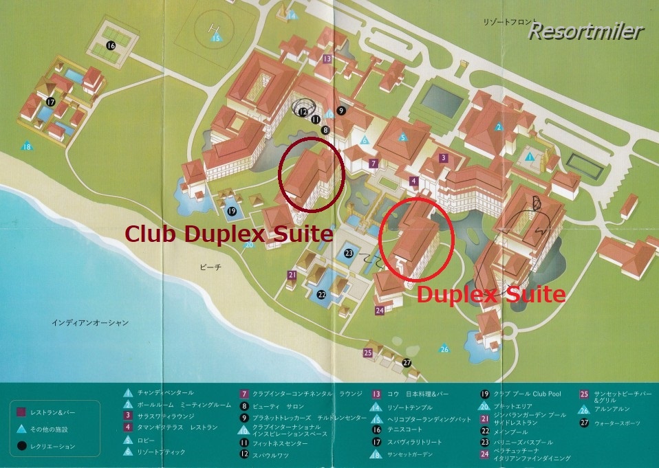 インターコンチネンタルリゾートバリのデュプレックススイートは2か所。赤丸は通常の(プレミアム)デュプレックススイートで茶丸がクラブラウンジアクセスのあるクラブデュプレックススイートです。