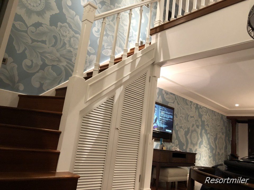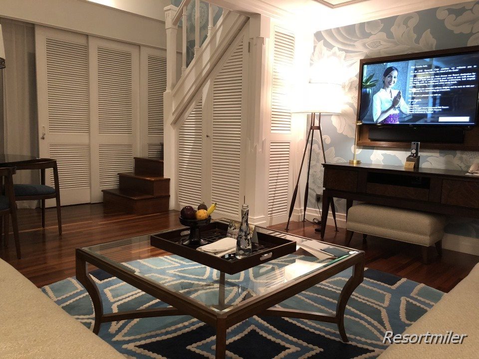 デュプレックススイートは1Fにリビングルーム、2Fにマスターベッドルームがあります。一部吹き抜け構造となっていて、開放感がありました。