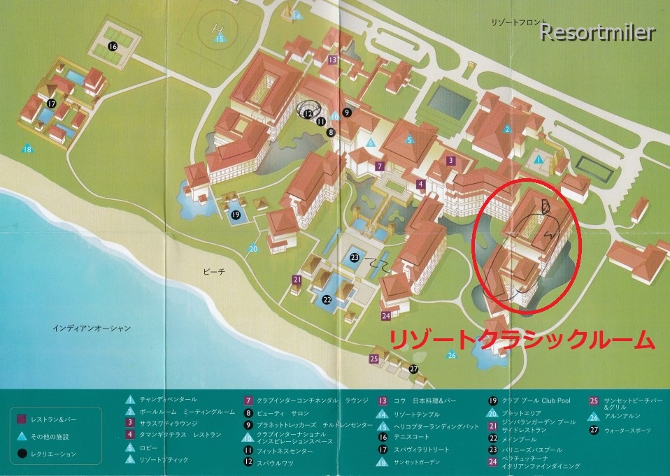インターコンチネンタルリゾートバリは大きく分けて4つの棟に分かれています。リゾートクラシックルームは地図で見ると赤丸で囲った一番右の棟でした。