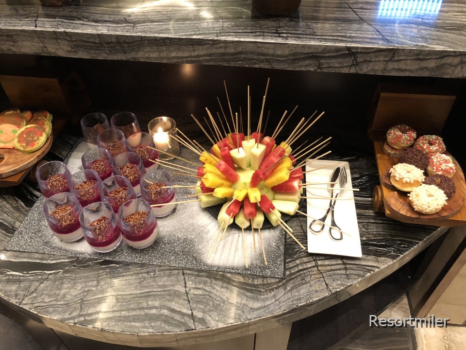 フルーツはウニ状です。子どもたちも取るのが楽しいですね。右にはドーナッツ、左にはヨーグルトもあります。