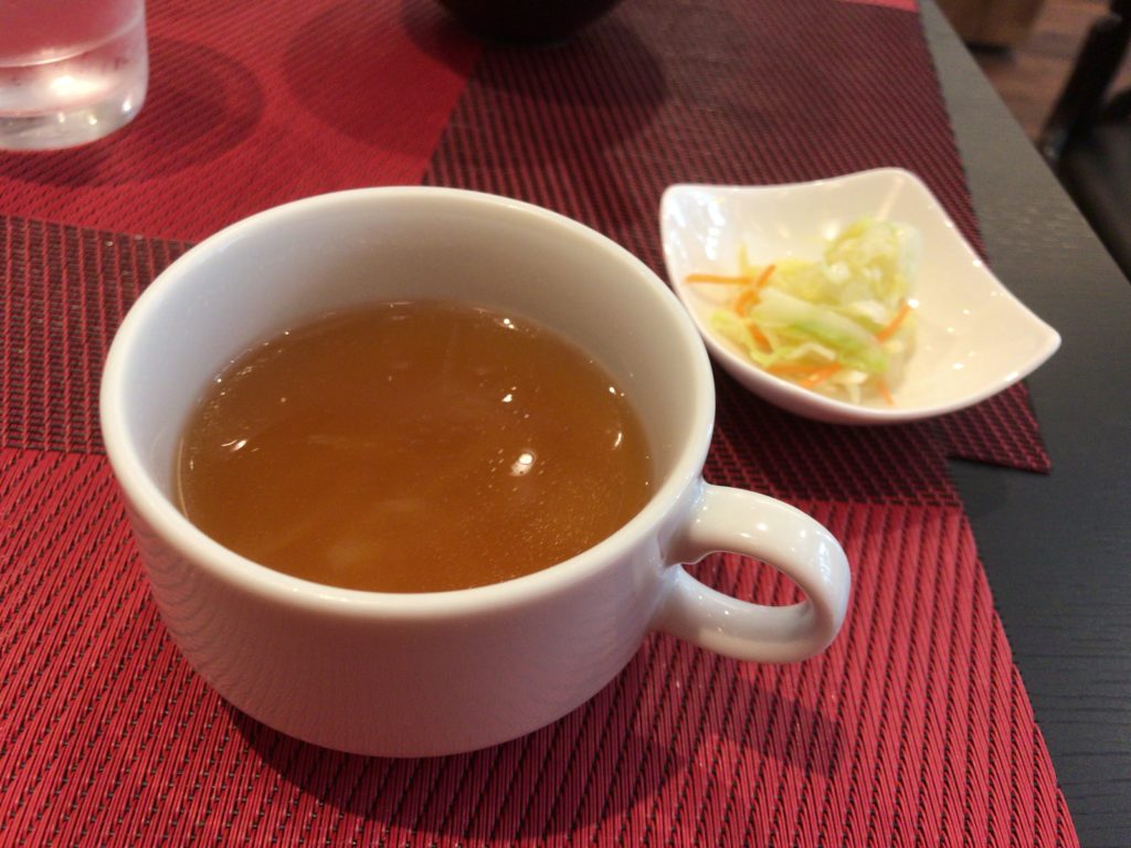 注文して3分程度、まずはスープとお漬物が提供されます。