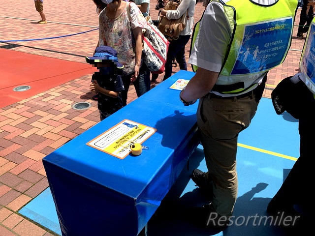 入園口付近には立て看板があり、体温測定、アルコール消毒が実施されています。