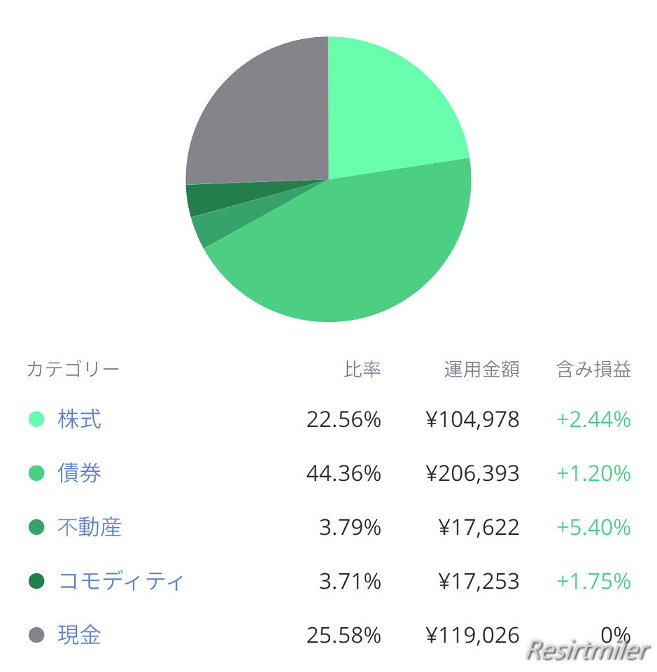 ロボアドバイザーの投資は株式、債券、コモディティ(金)、不動産です。