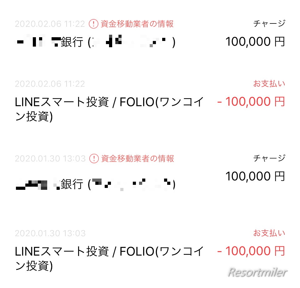 まずは銀行口座からLINE Payに振り込まれ、LINE Payからワンコイン投資へと移動します。