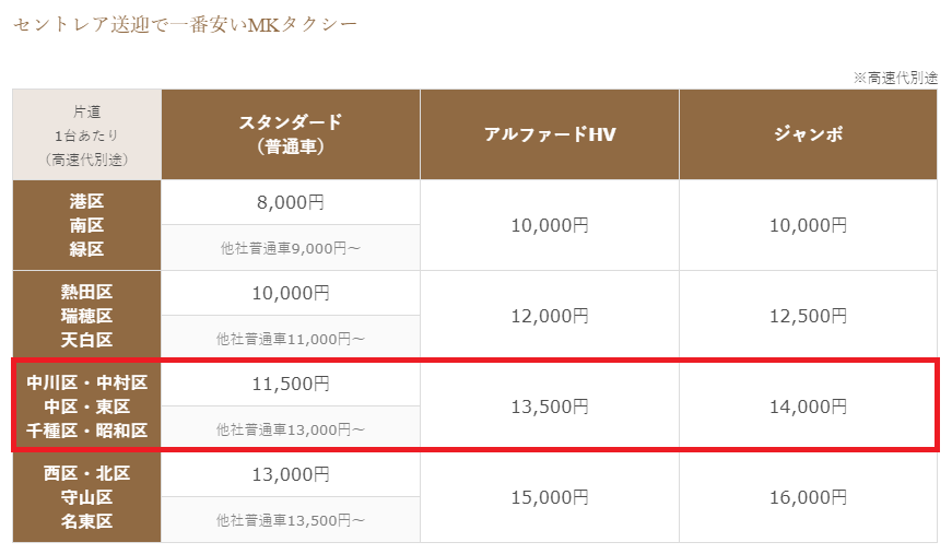 名古屋駅は中村区。スタンダードで11500円ですね。ただし、高速代は別途、2000円ほどだと思います。