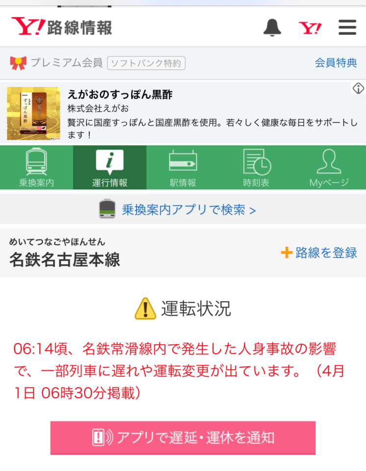 「大江と太田川間で発生した人身事故の影響により、ただいま常滑線の運転を見合わせております」