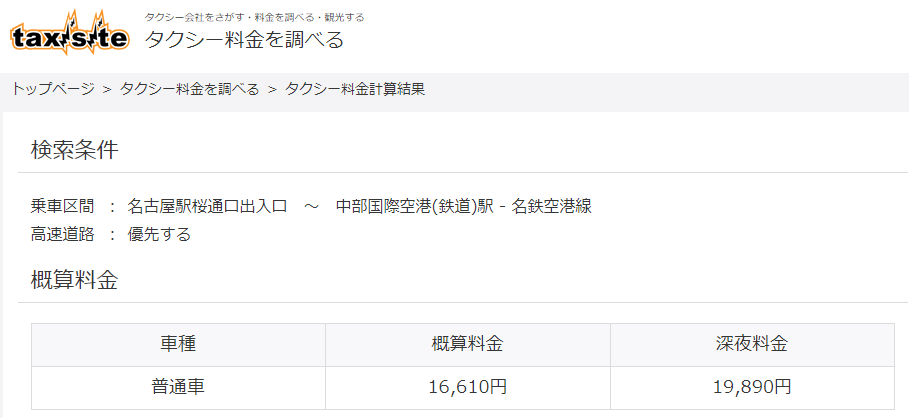 タクシー料金を調べるサイトで運賃を検索してみました。