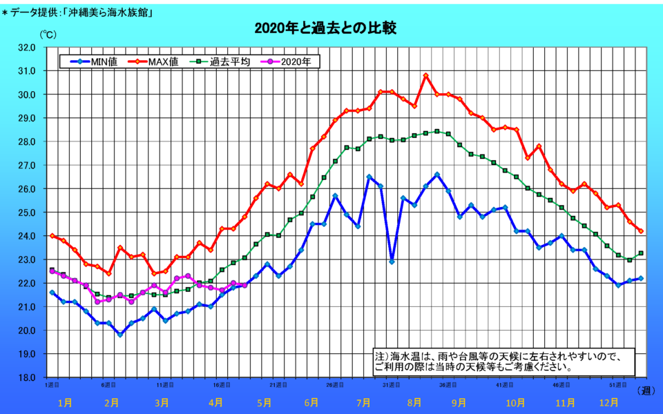 赤が過去最高、青が過去最低ですので、年によって3℃ほどの違いがあります。