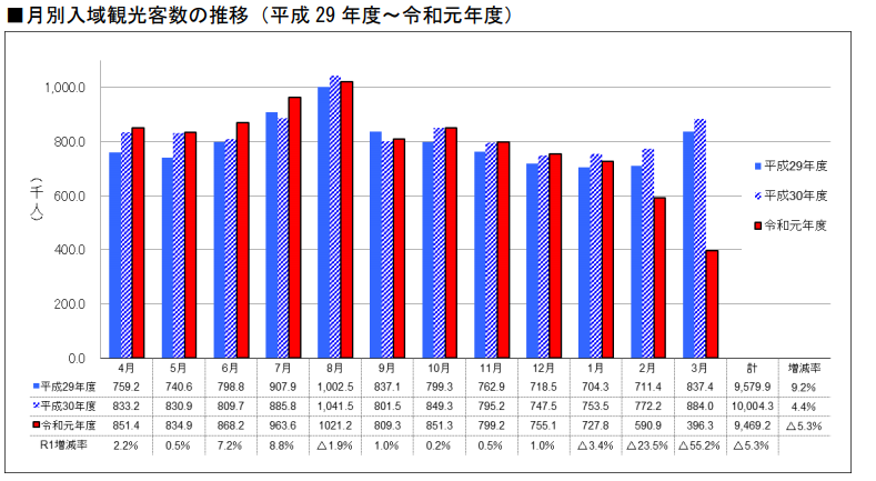過去3年間の観光客を見ると、沖縄の観光客は毎月80万人程度で安定しています。