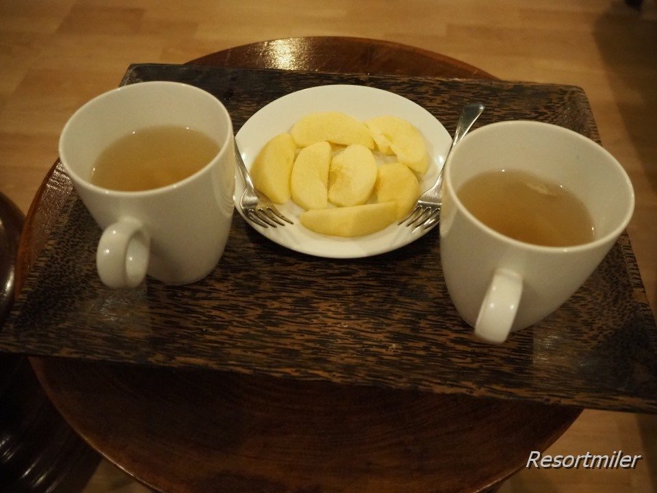 軽くシャワーを浴びた後で、カットされたリンゴとお茶を頂き、全行程終了。
