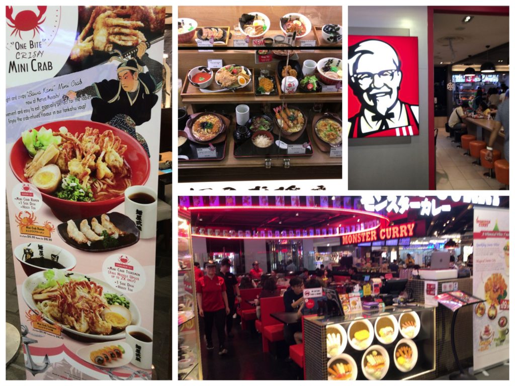 インターコンチネンタルシンガポールはショッピングモール「ブギスジャンクション」が直結なので、食べに行くにもテイクアウトするにも便利です。ブギスジャンクションをうろうろして、写真の店をピックアップ。麺屋武蔵のラーメン(左上2枚)、モンスターカレーのイートイン、ケンタッキーのテイクアウトです。