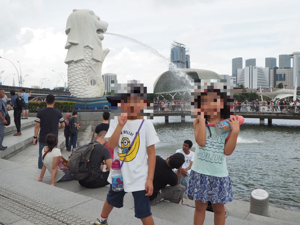 子どもたちもマーライオンに興味を持ったらしく、写真を撮って~ということで、記念写真。