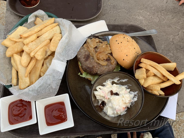 呼び出しベルが鳴って、ビーフバーガーとポテトを受け取ります。