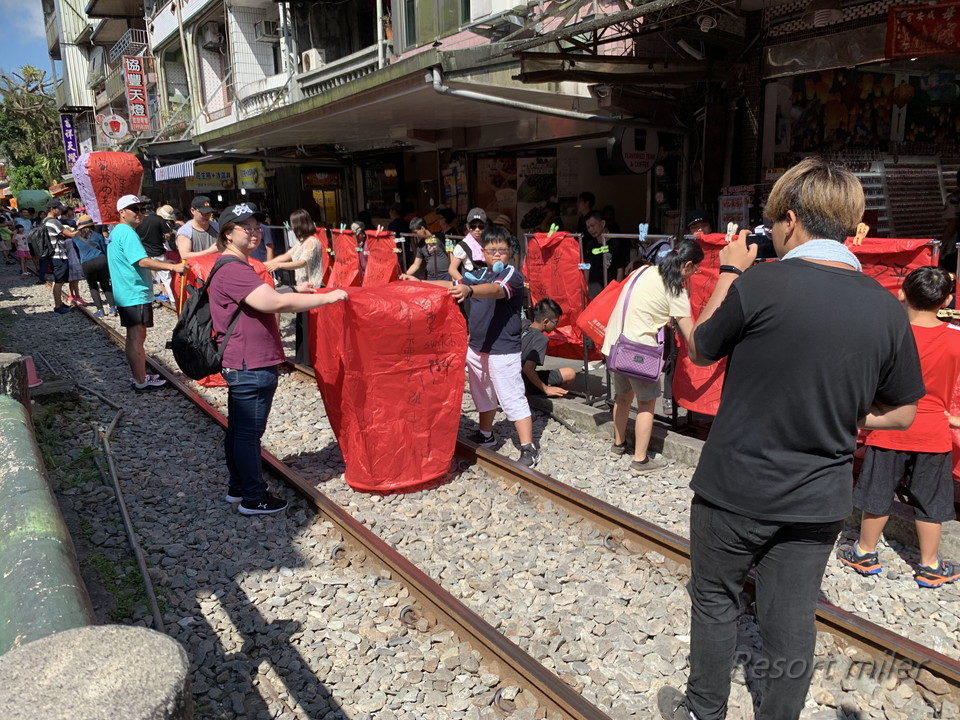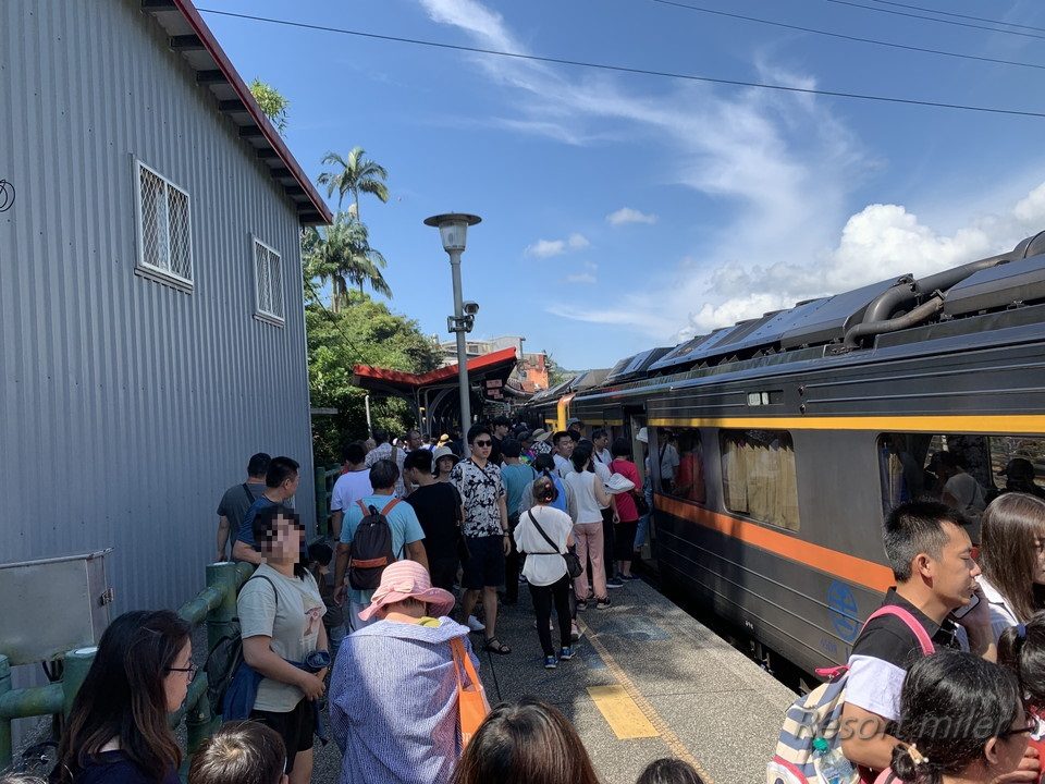 旅行したのは土曜日。十份駅のホームは人であふれかえっています。