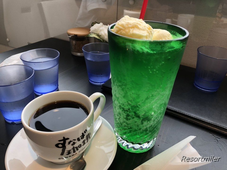 お待たせしました~とやってきたのは、ビッグサイズのメロンクリームソーダとコーヒー。どちらも超ビッグサイズです。