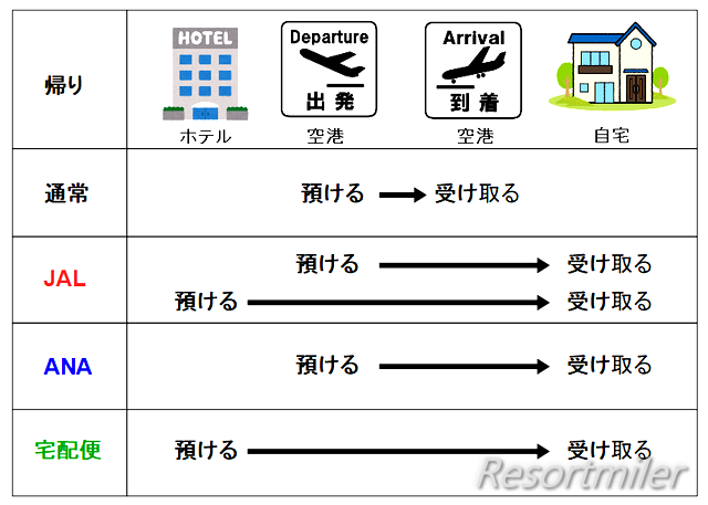 - ホテルで集荷して、受け取りは自宅で(JALにはできない)。