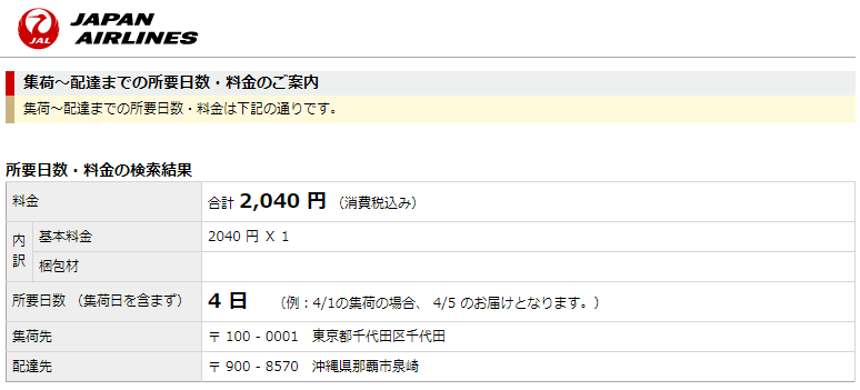 所要日数は、東京から那覇まで集荷日を含まず2日です。