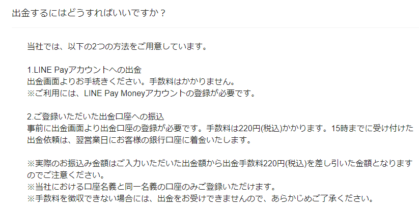 ご登録いただいた出金口座への振込事前に出金画面より出金口座の登録が必要です。手数料は220円(税込)かかります。15時までに受け付けた出金依頼は、翌営業日にお客様の銀行口座に着金いたします。
